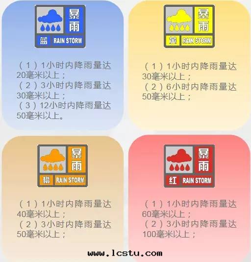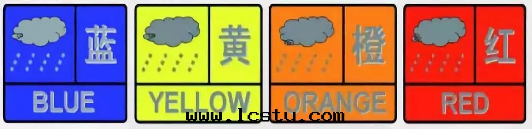 藍(lán)色(sè)預警(IV級):气(qì)象(xiàng)因(yīn)素致(zhì)地(dì)質(zhì)災害的(de)可(kě)能(néng)性(xìng)一(yī)般,有一(yī)定(dìng)風(fēng)險。 黃色(sè)預警(III級):气(qì)象(xiàng)因(yīn)素致(zhì)地(dì)質(zhì)災害的(de)可(kě)能(néng)性(xìng)較大(dà),風(fēng)險較高(gāo)。 橙色(sè)預警(II級):气(qì)象(xiàng)因(yīn)素致(zhì)地(dì)質(zhì)災害的(de)可(kě)能(néng)性(xìng)大(dà)、範圍大(dà)、规模大(dà)、風(fēng)險高(gāo)。 紅(hóng)色(sè)預警(I級):气(qì)象(xiàng)因(yīn)素致(zhì)地(dì)質(zhì)災害的(de)可(kě)能(néng)性(xìng)很大(dà)、範圍很大(dà)、规模很大(dà)、風(fēng)險很高(gāo)。
