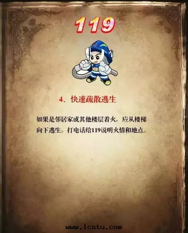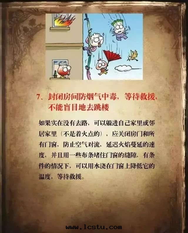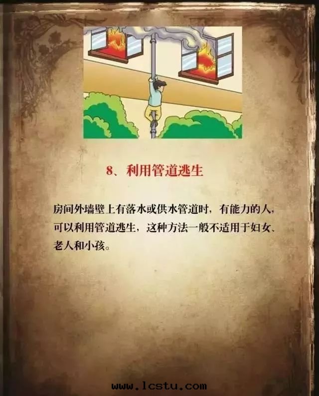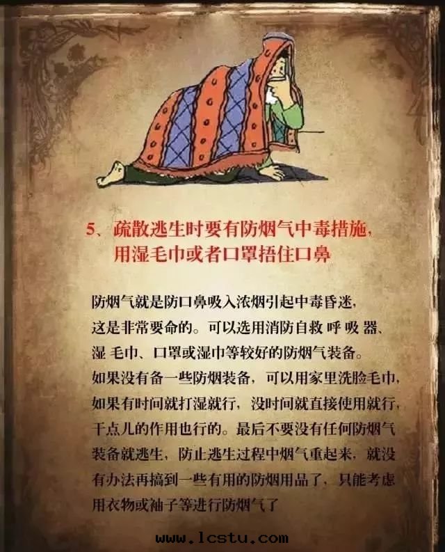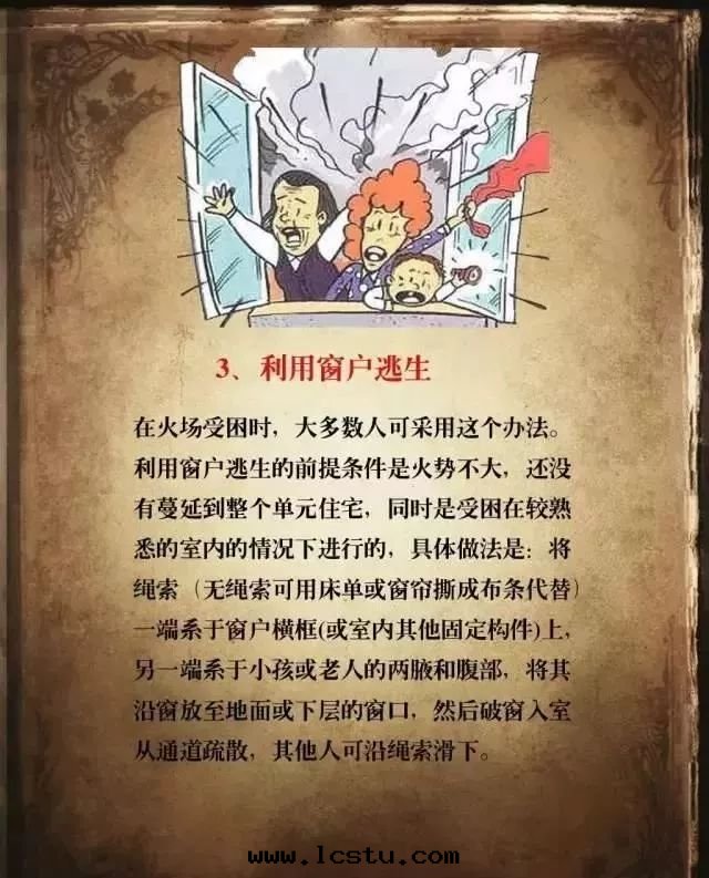 ●自(zì)救逃生(shēng)。发生(shēng)火災时(shí),要(yào)積极(jí)行動(dòng),不(bù)能(néng)坐以(yǐ)待斃,要(yào)充分(fēn)利用(yòng)身(shēn)邊(biān)的(de)各(gè)種(zhǒng)利于(yú)逃生(shēng)的(de)東(dōng)西(xī),如(rú)把(bǎ)床(chuáng)單、窗(chuāng)帘(lián)、地(dì)毯等接成(chéng)绳(shéng),進(jìn)行滑绳(shéng)自(zì)救,或(huò)将洗手(shǒu)间的(de)水(shuǐ)淋湿(shī)牆(qiáng)壁(bì)和(hé)門(mén),阻止火勢蔓延等。
