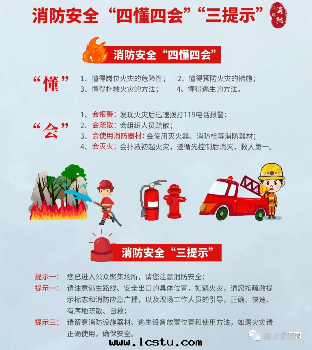 01、什(shén)麼(me)是(shì)三(sān)近(jìn)、三(sān)要(yào)、三(sān)救、三(sān)不(bù)? 三(sān)近(jìn): 1、距起(qǐ)火点近(jìn)的(de)員工負責利用(yòng)滅火器、室(shì)内消火栓、消防软(ruǎn)管(guǎn)等進(jìn)行滅火; 2、距電(diàn)話(huà)或(huò)火災報警点近(jìn)的(de)員工向(xiàng)消防队和(hé)單位(wèi)值班(bān)室(shì)報警; 3、距安(ān)全(quán)通(tòng)道(dào)或(huò)出(chū)口(kǒu)近(jìn)的(de)員工立即组織引導人員向(xiàng)安(ān)全(quán)地(dì)点疏散(sàn)。 三(sān)要(yào): 1、要(yào)熟悉自(zì)己住所(suǒ)的(de)环(huán)境; 2、要(yào)遇事(shì)保持(chí)沉着冷静(jìng); 3、要(yào)警惕煙毒的(de)侵害。 三(sān)救: 1、選擇逃生(shēng)通(tòng)道(dào)“自(zì)救”; 2、結绳(shéng)下(xià)滑“自(zì)救”; 3、向(xiàng)外(wài)界“求救”。 三(sān)不(bù): 1、不(bù)乘坐普通(tòng)電(diàn)梯(tī); 2、不(bù)要(yào)輕(qīng)易跳樓; 3、不(bù)要(yào)贪戀财物(wù)。 02、什(shén)麼(me)是(shì)消防安(ān)全(quán)重点單位(wèi)“六(liù)加一(yī)”措施 1、開(kāi)展(zhǎn)一(yī)次(cì)消防安(ān)全(quán)评估。 2、签订一(yī)份消防安(ān)全(quán)承諾書(shū)。 3、維護保養一(yī)次(cì)消防設施。 4、组織檢測一(yī)次(cì)電(diàn)气(qì)和(hé)燃气(qì)線(xiàn)路設施。 5、全(quán)面(miàn)清(qīng)洗一(yī)次(cì)油(yóu)煙道(dào)。 6、集中(zhōng)培訓一(yī)次(cì)全(quán)體(tǐ)員工。 建立一(yī)支志願消防队:确保一(yī)旦发生(shēng)火災,3分(fēn)鐘(zhōng)内形成(chéng)第(dì)一(yī)處(chù)置力量(liàng)到(dào)场(chǎng)撲救。