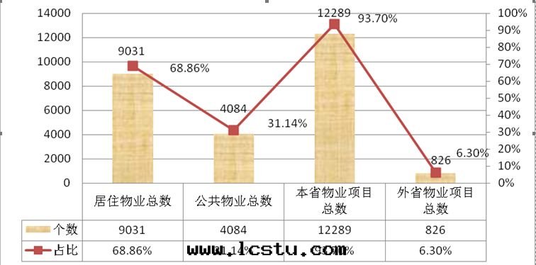 一(yī) 河(hé)南(nán)省(shěng)物(wù)業管(guǎn)理(lǐ)行業发展(zhǎn)基本(běn)概況 (一(yī))企業发展(zhǎn)情(qíng)況 截止2017年(nián)年(nián)底,全(quán)省(shěng)從事(shì)物(wù)業服(fú)务的(de)企業總(zǒng)數达(dá)7000餘家(jiā),受資質(zhì)取(qǔ)消影響,全(quán)年(nián)在(zài)工商登記(jì)部(bù)門(mén)登記(jì)從事(shì)物(wù)業服(fú)务的(de)企業近(jìn)800家(jiā),從業門(mén)檻降低(dī)效益凸顯。企業之(zhī)间的(de)兼並(bìng)、整合、合作(zuò)數量(liàng)明(míng)顯增加,市(shì)场(chǎng)活躍度(dù)不(bù)斷提(tí)升(shēng),规模企業數量(liàng)較往年(nián)增加明(míng)顯。 經(jīng)統計(jì),截止2017年(nián),物(wù)業服(fú)务企業共(gòng)計(jì)在(zài)管(guǎn)13115个(gè)服(fú)务項目,其(qí)中(zhōng)居(jū)住物(wù)業項目9031个(gè),占比68.9%,公共(gòng)物(wù)業項目4084个(gè),占比31.1%;本(běn)省(shěng)市(shì)物(wù)業項目12289个(gè),占比93.7%,外(wài)省(shěng)市(shì)物(wù)業項目826个(gè),占比6.3%(图(tú)1)。调查顯示,河(hé)南(nán)省(shěng)物(wù)業服(fú)务企業在(zài)省(shěng)外(wài)接管(guǎn)項目較2016年(nián)增加近(jìn)100个(gè),河(hé)南(nán)物(wù)業服(fú)务企業跨省(shěng)市(shì)服(fú)务能(néng)力進(jìn)一(yī)步增強(qiáng)。