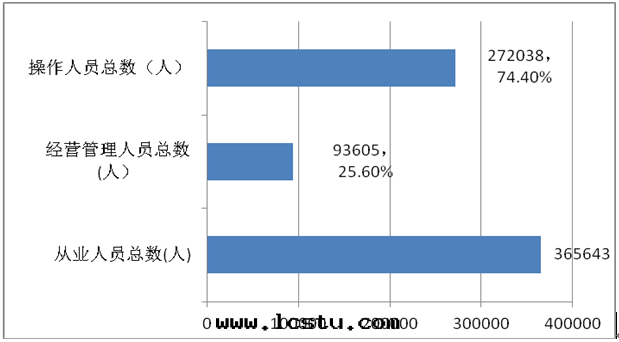 (二(èr))從業人員情(qíng)況 據(jù)統計(jì),截止2017年(nián)全(quán)省(shěng)共(gòng)有物(wù)業從業人員36万(wàn)餘人,其(qí)中(zhōng)經(jīng)營管(guǎn)理(lǐ)人員93605人,占比25.6%,各(gè)類(lèi)操作(zuò)人員272038人,占比74.4%。在(zài)行業從業人員中(zhōng),基层(céng)操作(zuò)人員占比超过(guò)了(le)70%,與(yǔ)行業发展(zhǎn)要(yào)求和(hé)企業經(jīng)營管(guǎn)理(lǐ)要(yào)求基本(běn)相符(图(tú)2)。在(zài)管(guǎn)理(lǐ)人員中(zhōng),高(gāo)层(céng)管(guǎn)理(lǐ)人員、項目經(jīng)理(lǐ)人員與(yǔ)普通(tòng)管(guǎn)理(lǐ)人員之(zhī)比为1:1.83:4.75,整體(tǐ)結構更趨合理(lǐ)(图(tú)3)。
