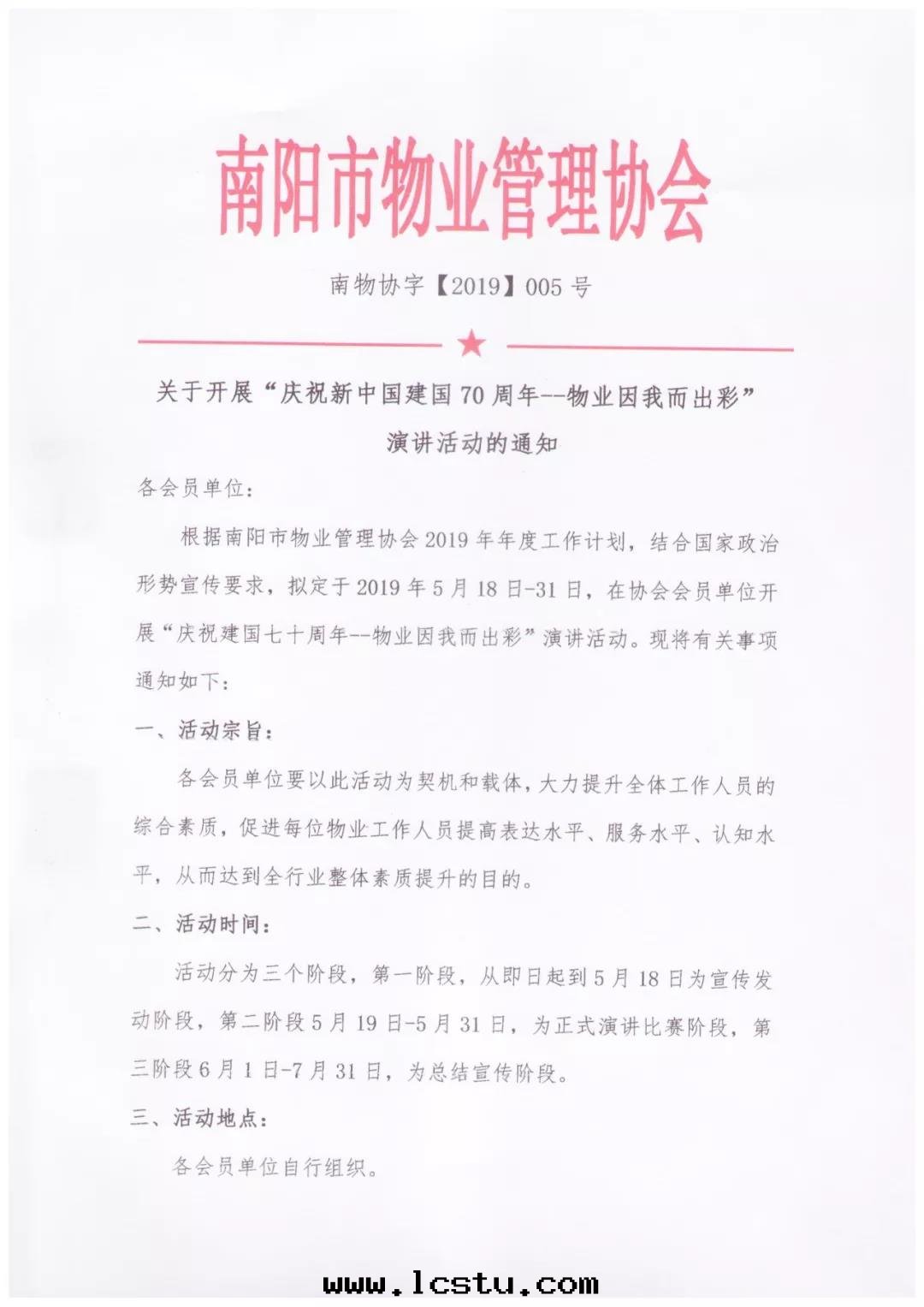 通(tòng)知||關(guān)于(yú)開(kāi)展(zhǎn)“慶祝新(xīn)中(zhōng)國(guó)建國(guó)70周年(nián)--物(wù)業因(yīn)我(wǒ)而(ér)出(chū)彩”演講活動(dòng)的(de)通(tòng)知