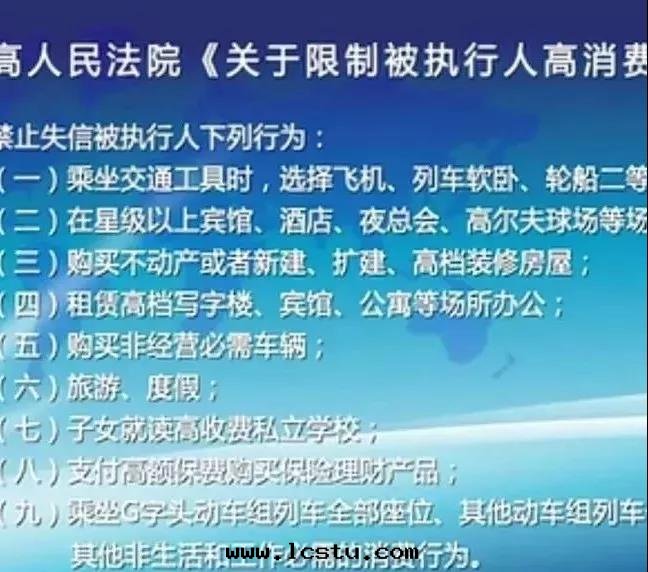 《關(guān)于(yú)加快(kuài)推進(jìn)失信(xìn)被(bèi)執行人信(xìn)用(yòng)監督、警示和(hé)懲戒机制建設的(de)意(yì)見(jiàn)》就(jiù)指出(chū),失信(xìn)被(bèi)執行人将在(zài)乘坐火車、飛机,住宿賓館(guǎn)饭店(diàn),高(gāo)消费旅遊,子女就(jiù)读(dú)高(gāo)收(shōu)费學(xué)校(xiào),購買(mǎi)具有現(xiàn)金(jīn)價值保險,新(xīn)建、擴建、高(gāo)档装修房(fáng)屋(wū)、購車、出(chū)境等方(fāng)面(miàn)受到(dào)限制。