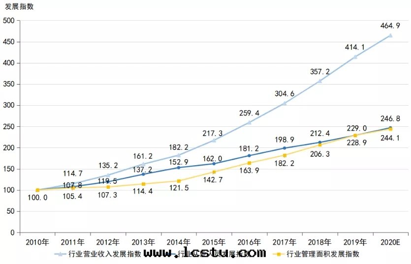 图(tú)1 2010-2020年(nián)物(wù)業管(guǎn)理(lǐ)行業发展(zhǎn)指數情(qíng)況 (二(èr))營業收(shōu)入(rù)发展(zhǎn)指數达(dá)到(dào)464.9,行業産值超过(guò)万(wàn)亿(yì)