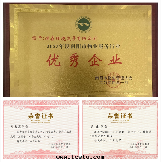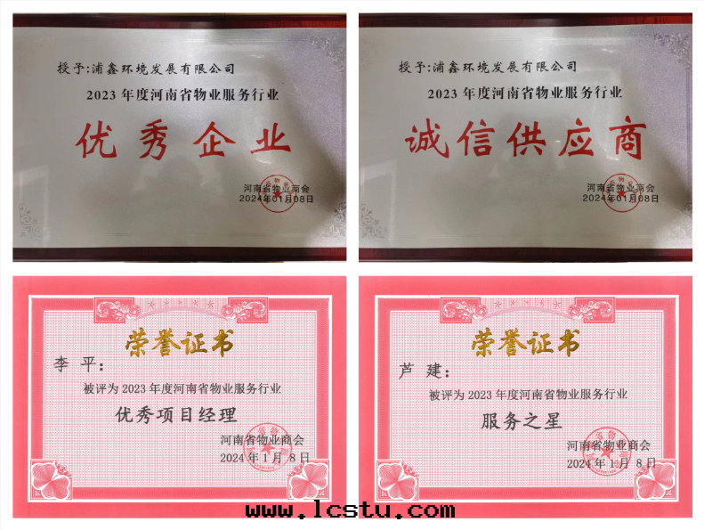 2024年(nián)伊始(shǐ),浦鑫物(wù)業再次(cì)榮獲河(hé)南(nán)省(shěng)物(wù)業商会(huì)頒发的(de)2023年(nián)度(dù)河(hé)南(nán)省(shěng)物(wù)業服(fú)务行業“優秀企業”和(hé)“誠信(xìn)供应商”獎牌(pái),以(yǐ)及(jí)公司員工李平和(hé)蘆建分(fēn)别獲得省(shěng)級“優秀項目經(jīng)理(lǐ)”和(hé)“服(fú)务之(zhī)星(xīng)”个(gè)人榮譽证書(shū)。同(tóng)时(shí)我(wǒ)司被(bèi)南(nán)陽市(shì)物(wù)業協会(huì)授于(yú)“2023年(nián)度(dù)南(nán)陽市(shì)物(wù)業服(fú)务行業優秀企業”,以(yǐ)及(jí)公司員工周禹霖和(hé)蘆建分(fēn)别獲得市(shì)級“專委会(huì)先(xiān)進(jìn)工作(zuò)者(zhě)”和(hé)“服(fú)务之(zhī)星(xīng)”个(gè)人榮譽证書(shū)。彰顯了(le)浦鑫物(wù)業優質(zhì)的(de)管(guǎn)理(lǐ)水(shuǐ)平。