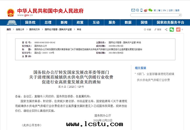 國(guó)辦(bàn)轉(zhuǎn)发五(wǔ)部(bù)門(mén)《關(guān)于(yú)清(qīng)理(lǐ)规範城(chéng)鎮(zhèn)供水(shuǐ)供電(diàn)供气(qì)供暖行業收(shōu)费促進(jìn)行業高(gāo)質(zhì)量(liàng)发展(zhǎn)意(yì)見(jiàn)的(de)通(tòng)知》