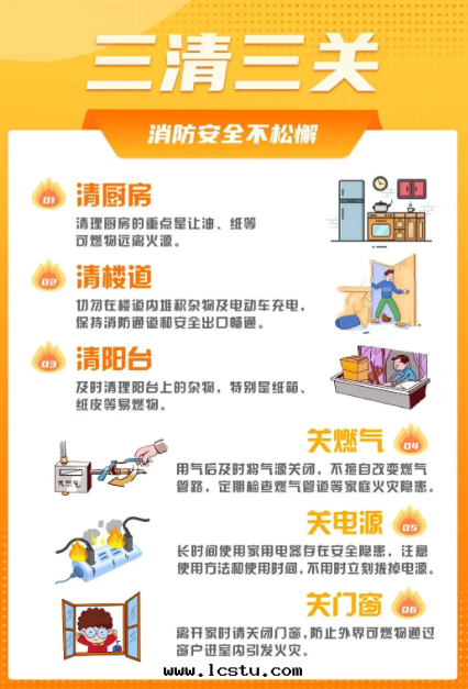 消防安(ān)全(quán)往往就(jiù)藏在(zài)生(shēng)活的(de)细(xì)节(jié)里(lǐ)睡前(qián)斷電(diàn),人走(zǒu)火滅这(zhè)些(xiē)習慣是(shì)生(shēng)命的(de)重要(yào)防線(xiàn)千(qiān)万(wàn)讓别因(yīn)一(yī)时(shí)疏忽釀成(chéng)大(dà)禍居(jū)家(jiā)防火一(yī)定(dìng)要(yào)做到(dào)“三(sān)清(qīng)三(sān)關(guān)”